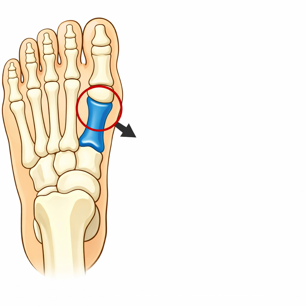 強剛母趾は、足の親指の付け根にある関節(MTP関節)に負担が集中し続けた結果、軟骨がすり減って動きが悪くなり、親指を反らしにくくなる状態を指します。歩くとき、本来は親指の付け根で地面をぐっと蹴り出しますが、このときに関節がスムーズに曲がらなくなっているため、踏み込んだ瞬間に痛みや違和感が出やすくなります。進行してくると関節の周りに骨のトゲのような出っ張りができ、靴との擦れによる痛みや腫れも加わり、ますます「歩く」「立つ」という動作そのものが負担に感じられてしまいます。