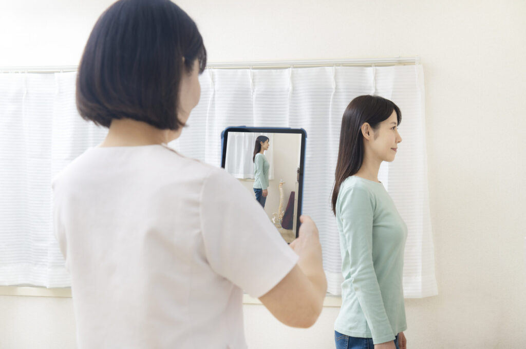 - 姿勢分析・・頭、肩が前方にあり、猫背で巻き肩 下肢のバランスは良い